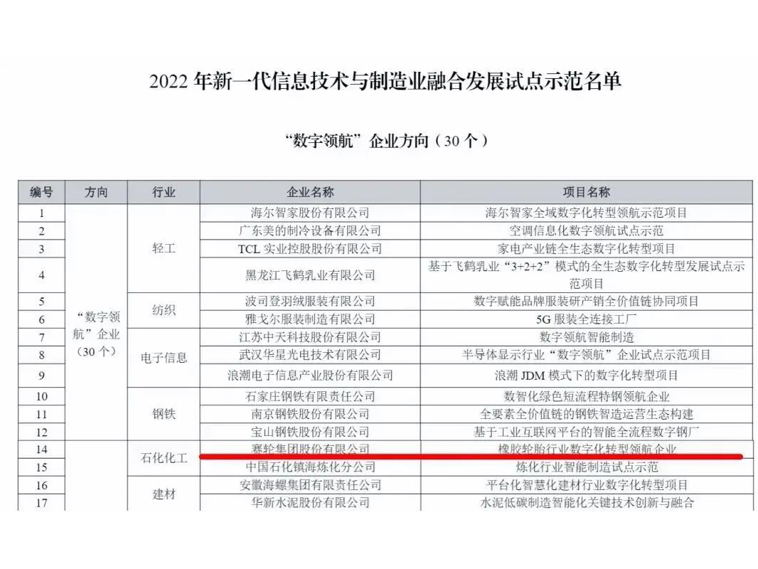 10月31日,工業(yè)和信息化部網(wǎng)站公示了2022年新一代信息技術(shù)與制造業(yè)融合發(fā)展試點示范名單,在本次試點示范中,工信部首次提出了“數(shù)字領(lǐng)航”企業(yè)方向。本次公布的首批30家數(shù)字領(lǐng)航企業(yè)中,賽輪集團(tuán)是橡膠輪胎行業(yè)唯一入圍企業(yè)。