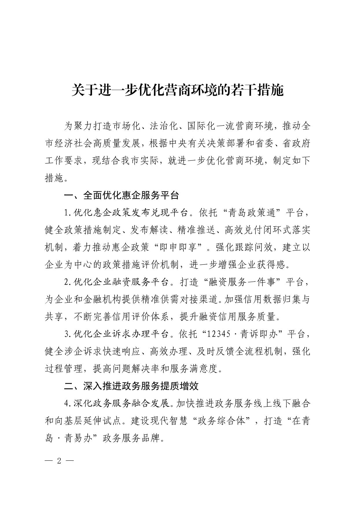 轉(zhuǎn)發(fā) 中共青島市委辦公廳 青島市人民政府辦公廳 印發(fā)《關(guān)于進(jìn)一步優(yōu)化營(yíng)商環(huán)境的 若干措施》的通知